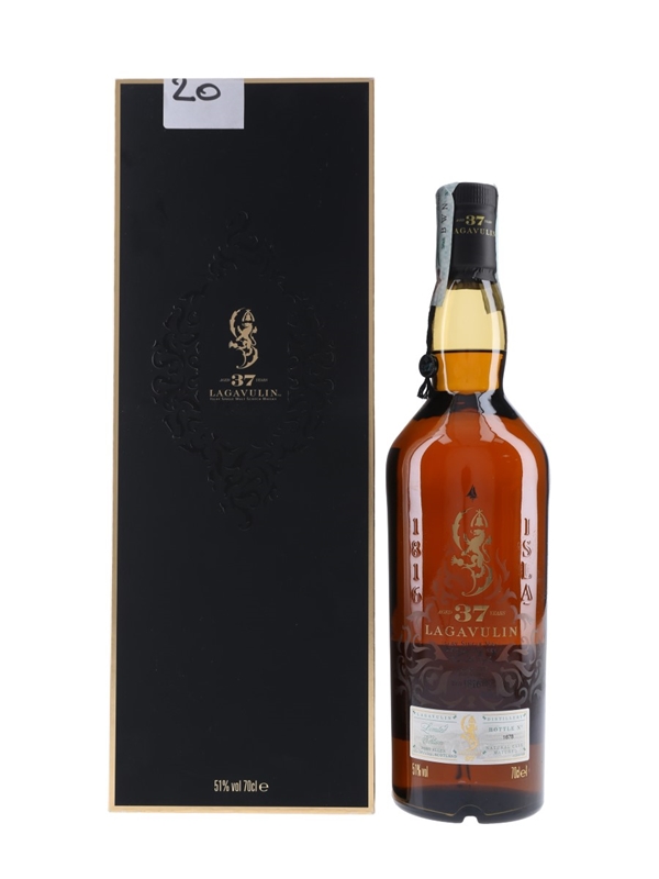 A limited edition bottle of Lagavulin 37 Year Old Single Malt Scotch Whisky. This was distilled in 1976 and bottled at natural cask strength for Diageo's Special Releases 2013.