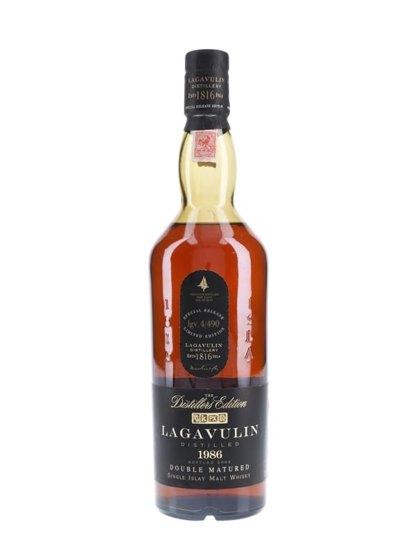 A bottle of Lagavulin 1986 Islay Single Malt Scotch Whisky. This was distilled in 1986, finished in ex-Pedro Ximinez sherry casks and bottled 2002 for the Distillers Edition series.