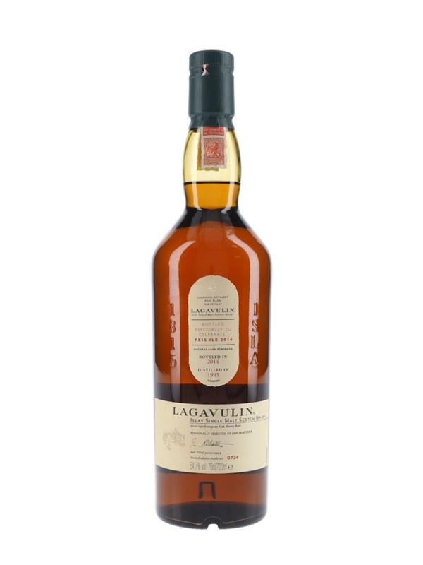 A bottle of Lagavulin Islay Single Malt Scotch Whisky. This was distilled on 30 January 1995, matured in an European oak sherry butt, selected by Iain McArthur and bottled at 54.7% ABV especially for Feis Ile 2014, the Islay festival of music and malt.