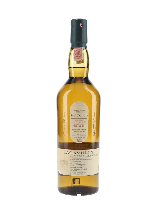 A bottle of Lagavulin Islay Single Malt Scotch Whisky. This was distilled on 23 February 1998, matured in a refill sherry butt, selected from Warehouse No.1 by Iain McArthur and bottled at 55.1% ABV especially for Feis Ile 2012, the Islay festival of music and malt.