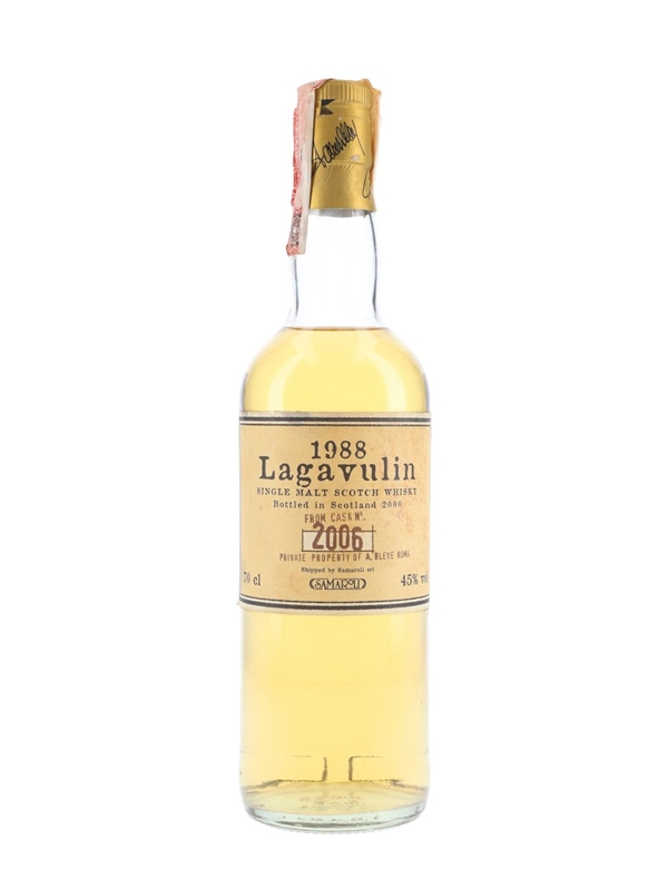 A bottle of Lagavulin 1988 Islay Single Malt Scotch Whisky. This was distilled in 1988 and bottled in 2000 by Samaroli.