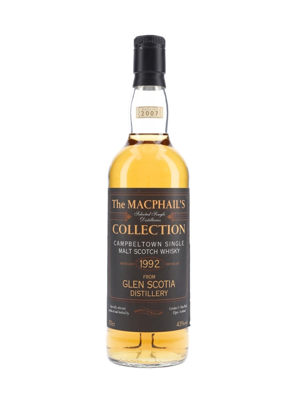 A bottle of Glen Scotia Single Campbeltown Malt Scotch Whisky. This was distilled in 1992 and bottled in 2007 by Gordon & MacPhail as part of the MacPhail's Collection.