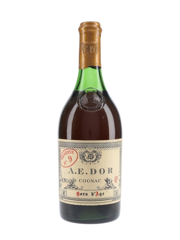 A bottle of A E Dor Hors d'Age Reserve No.9 Cognac, matured for around half a century in oak casks.