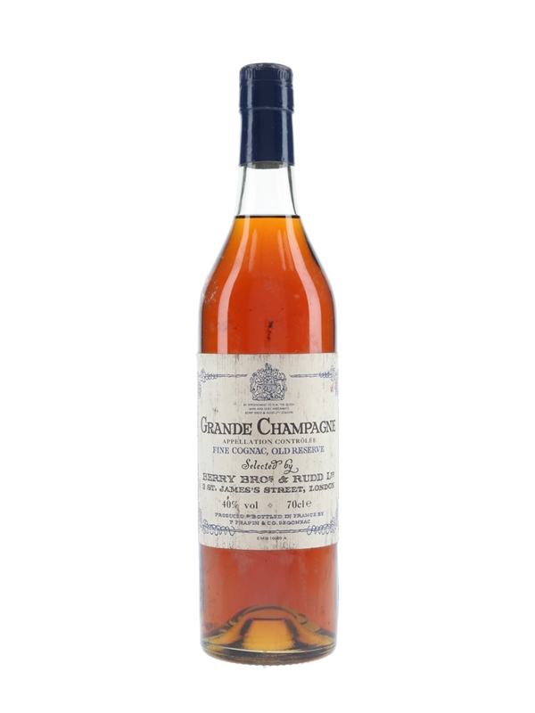 A bottle of Grande Champagne Old Reserve Fine Cognac from France. This was produced and bottled in France by P Frapin & Co. and selected by Berry Bros & Rudd.