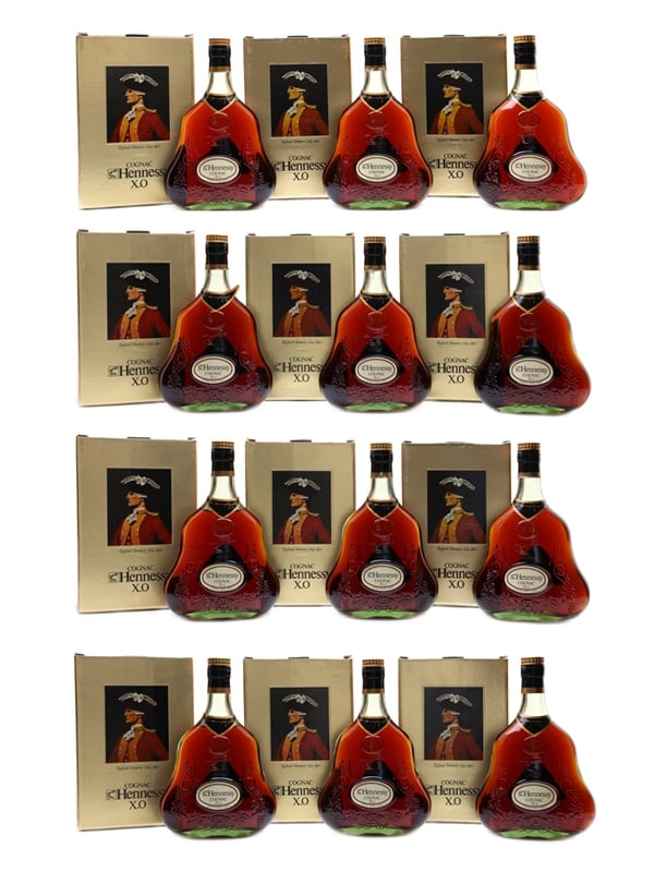A case of 12 bottles of Hennessy XO Cognac, presented in the original cardboard box. Each bottle is in an individual box with the original paper wrapping.