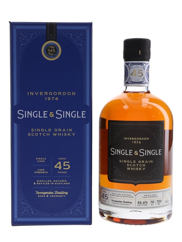 A bottle of Invergordon 45 Year Old Single Grain Scotch Whisky. This was distilled in 1974 and bottled at 46.6% ABV for Single & Single.
