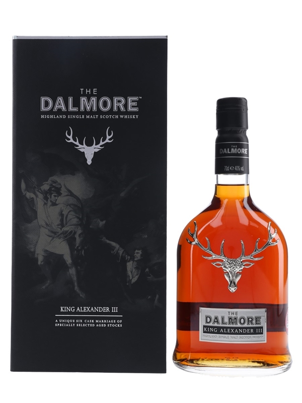 A bottle of The Dalmore King Alexander III, a combination of whiskies matured in French wine casks, Madeira drums, sherry butts, Marsala barrels, port pipes and bourbon barrels from Kentucky, selected by Master Distiller Richard Paterson.