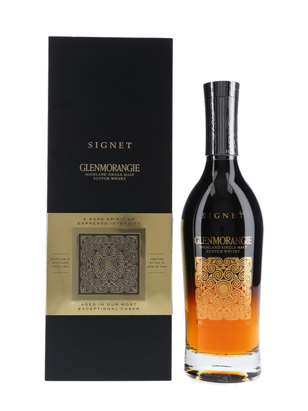 A bottle of Glenmorangie Signet Highland Single Malt Scotch Whisky. Some of the spirit in this bottling has been distilled from chocolate malt, commonly used in stouts and porters.