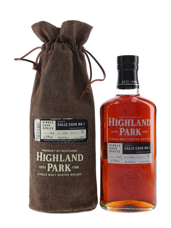 A bottle of Highland Park 13 Year Old Single Malt Scotch Whisky. This was distilled in 2003 and bottled from a refill butt in 2016 as part of the Single Cask series, exclusively for Calle Cask No.1.