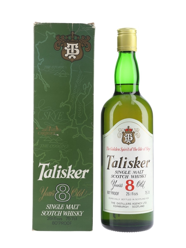 A bottle of Talisker 8 Year Old Single Malt Scotch Whisky. The label features the distinctive DT crest on the label. This was specially bottled for the Distiller's Agency, we estimate in the 1970s.