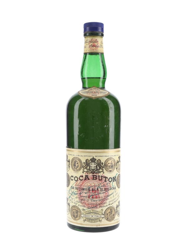 A bottle of Coca Buton, an Italian liqueur made from alcohol infused with coca leaves and other aromatic herbs. We estimate this was bottled in the 1950s.