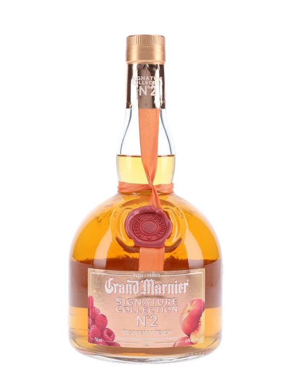 A bottle of Grand Marnier Raspberry Peach bottled as a part of the Signature Collection No 2.