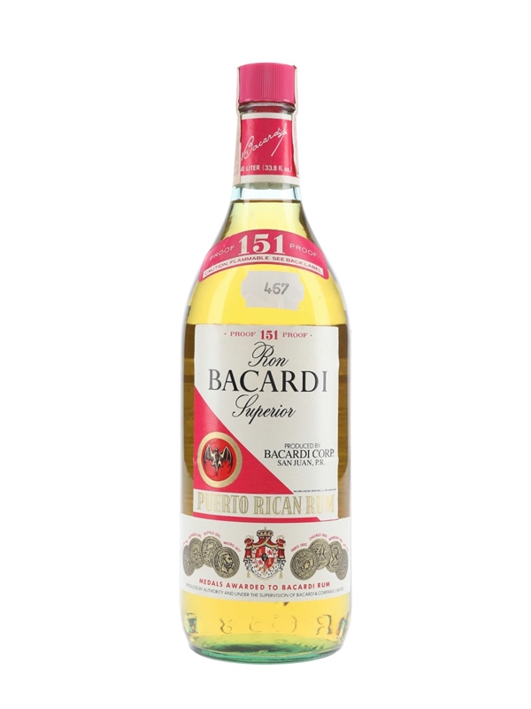 A litre bottle of Bacardi 151° produced in San Juan, Puerto Rico, and bottled at 151 Proof or 75.5% ABV. We estimate this was bottled in the 1970s.