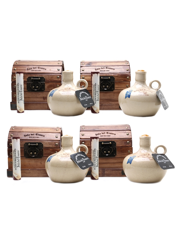 This case contains four ceramic jugs of Isla del Tesoro Extra Añejo rum from Santiago de Cuba. Isla del Tesoro Extra Añejo is a blended rum aged for a minimum of 20 years, and each jug is presented in a wooden treasure chest and a hessian bag.