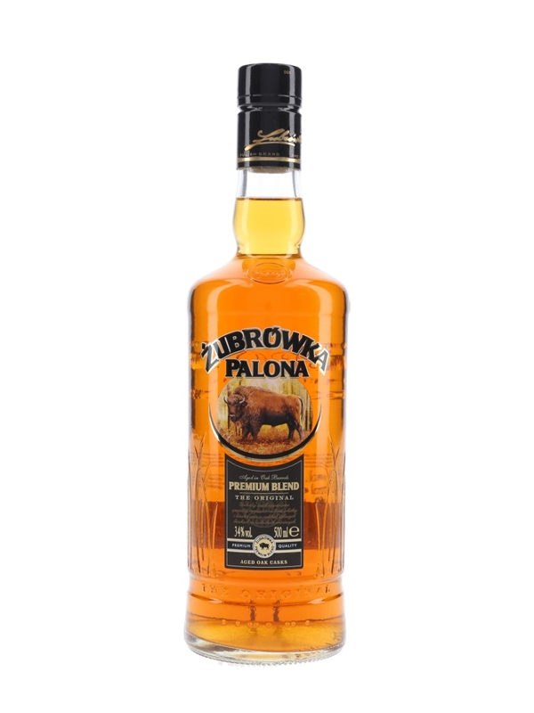 A 50cl bottle of Zubrowka Palona, a Polish vodka matured in casks which used to hold cherry liqueur.