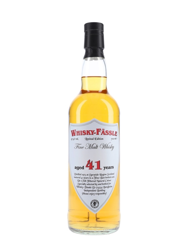 A bottle of Speyside 41 Year Old Fine Malt Scotch Whisky. This was distilled in 1975, matured for 41 years in a Fino butt and specially selected and bottled for Whisky-Fässel in 2016.