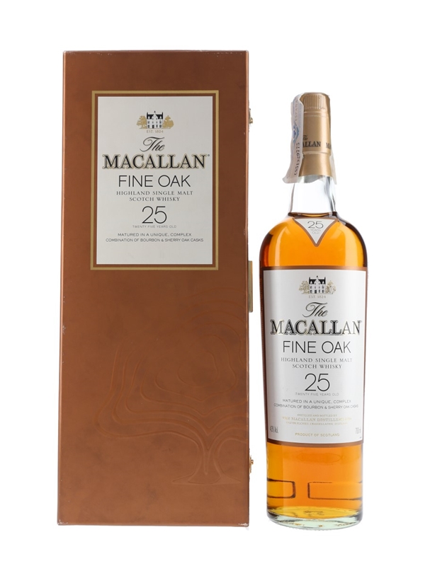 A bottle of The Macallan 25 Year Old from the Fine Oak range, matured in a combination of bourbon and sherry casks.