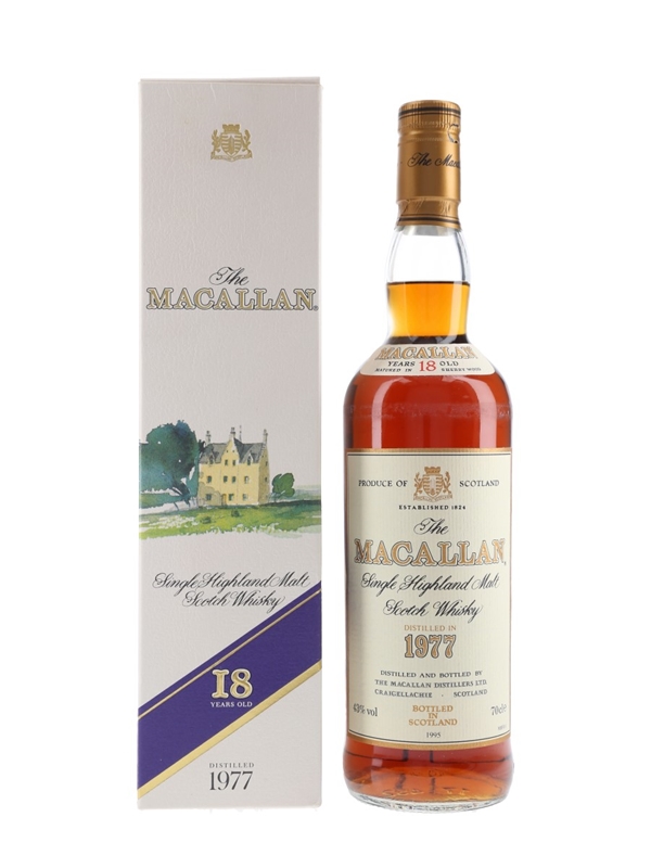 A bottle of The Macallan 18 Year Old Single Highland Malt Scotch Whisky. This was distilled in 1977, matured in sherry casks and bottled in 1995.