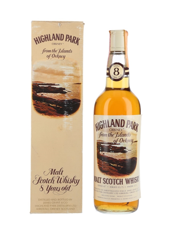 A bottle of Highland Park 8 Year Old Malt Scotch Whisky from the Islands of Orkney. This was distilled and bottled by James Grant & Co. for Italian importer Ferraretto, we estimate in the 1970s.