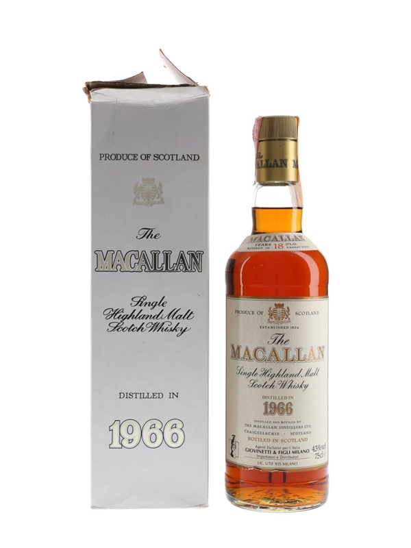 A bottle of The Macallan 18 Year Old, distilled in 1966 and imported for the Italian market by Giovinetti & Figli.