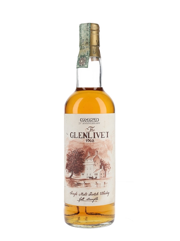 A bottle of The Glenlivet 1968 Single Malt Scotch Whisky. This was distilled in 1968 and bottled in 1993 to commemorate the 25th anniversary of Italian importer Samaroli.