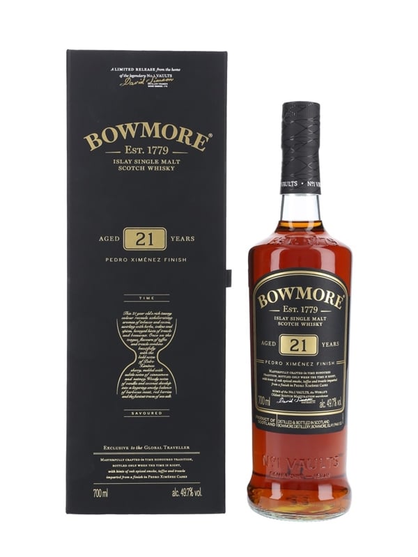 A limited edition bottle of Bowmore 21 Year Old Islay Single Malt Scotch Whisky. This was finished in Pedro Ximenez casks and bottled at 49.7% ABV for global travel retail.