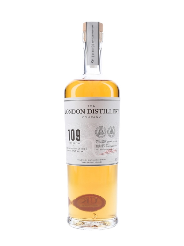 A bottle of The London Distillery Company 109 Cask Edition single malt whisky. This was produced from Plummage Archer barley using 1920s distiller and Whitbread B yeast. The whisky was filled in to 20 litre ex-bourbon casks on 9 September 2015, and matured for three years before bottling at cask strength.