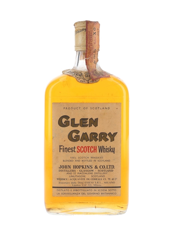 A bottle of Glen Garry Finest Scotch Whisky, distilled and bottled by John Hopkins & Co., distillers in Glasgow and St Magdalene Distillery, Scotland. This was bottled for the Italian market and imported by Essevi, we estimate in the 1970s.