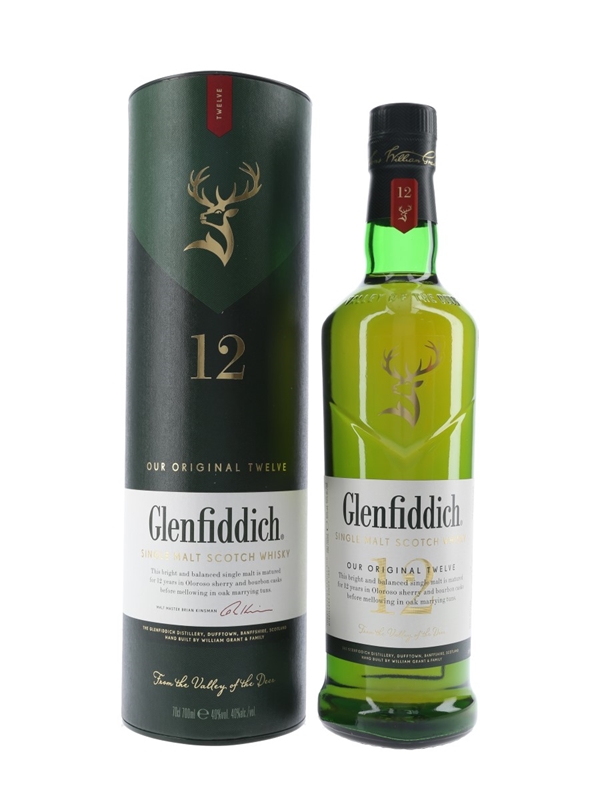 A bottle of Glenfiddich 12 Year Old, matured in oloroso sherry and bourbon casks.