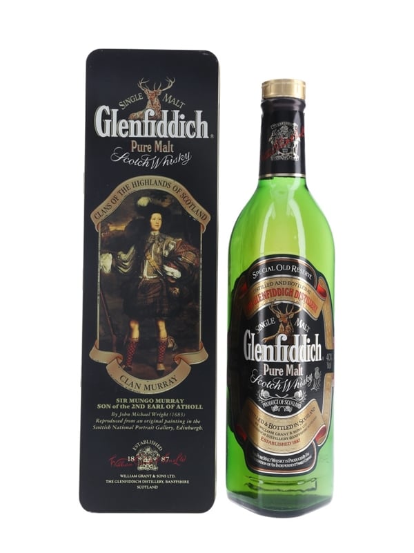 A bottle of Glenfiddich Special Reserve Single Malt Scotch Whisky in a Clans of the Highlands of Scotland presentation tin.
