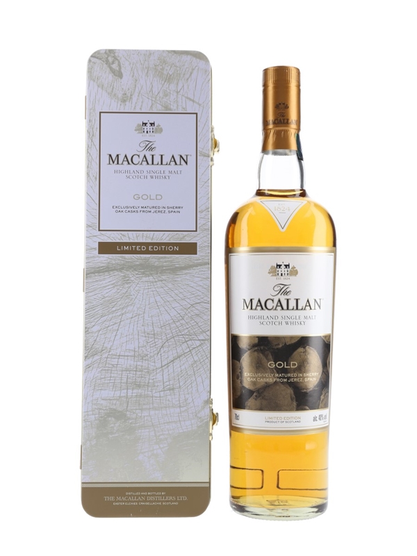 A limited edition bottle of The Macallan Gold Highland Single Malt Scotch Whisky, matured in Spanish sherry oak casks and presented in a tin. This is the second in a series of annual releases celebrating The Macallan's Exceptional Oak Casks.