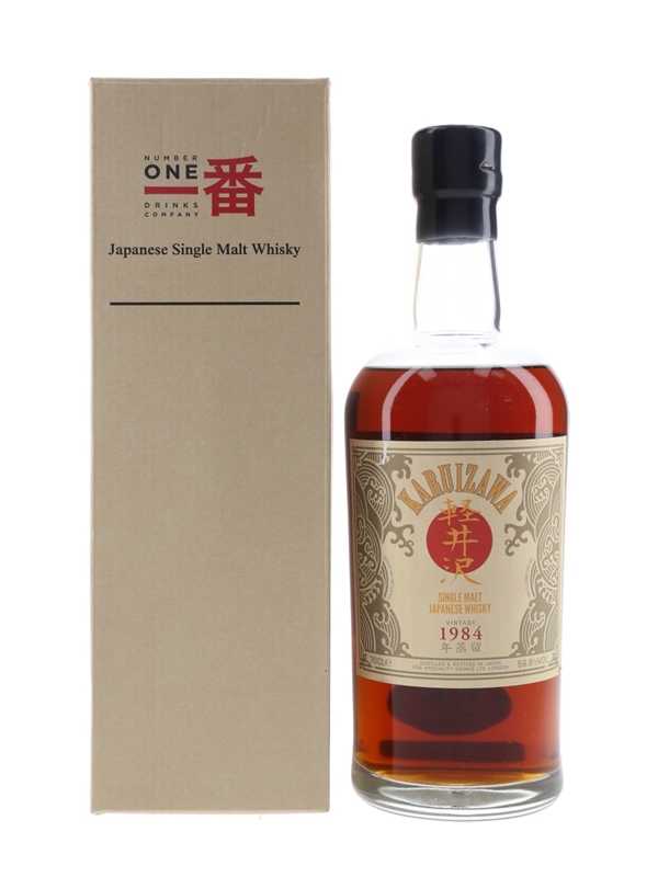 A bottle of Karuizawa 1984 Single Malt Japanese Whisky. This was distilled in 1984, matured in a first fill sherry cask, and bottled in 2013 by Number One Drinks Company for Speciality Drinks Ltd.