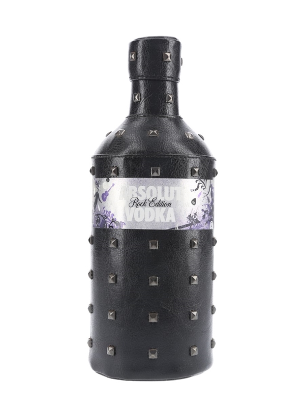 A bottle of Absolut Rock Edition Vodka from Sweden, presented in a studded leather jacket.
