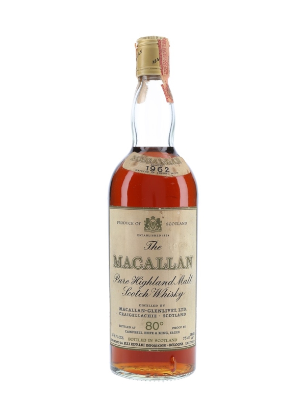A bottle of The Macallan 1962 Pure Highland Malt Scotch Whisky. This was distilled in 1962 and bottled by Campbell, Hope & King. This was imported to Italy by Rinaldi, we estimate in the 1970s.