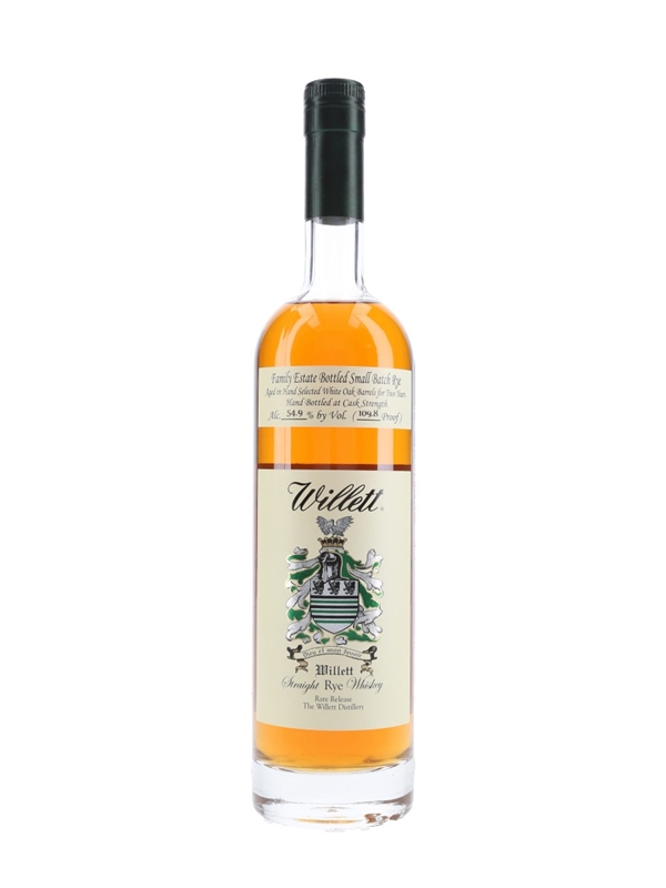 A bottle of Willett Family Estate 2 Year Old Small Batch Straight Rye Whiskey. This was matured for two years in hand selected white oak barrels and bottled at 54.9% ABV.