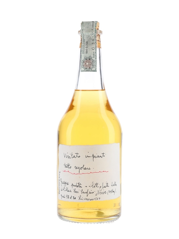 A bottle of Romano Levi Visitato Impianti Tutto Regolare grappa, produced at Distilleria Levi Serafino and bottled in 2004.