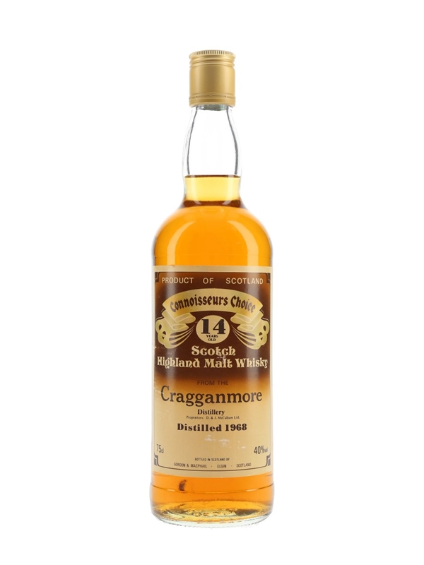 A bottle of Cragganmore 14 Year Old Scotch Highland Malt Whisky, distilled in 1968 and bottled by Gordon & MacPhail as part of the Connoisseurs Choice series.