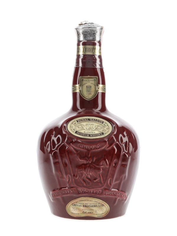 A bottle of Chivas Brothers' Royal Salute 21 Year Old Blended Scotch Whisky, presented in a red Wade decanter. We estimate this was bottled in the 1980s.