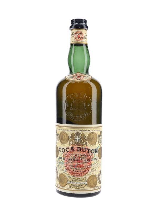 A bottle of Coca Buton, an Italian liqueur made from alcohol infused with coca leaves and other aromatic herbs. We estimate this was bottled in the 1950s.