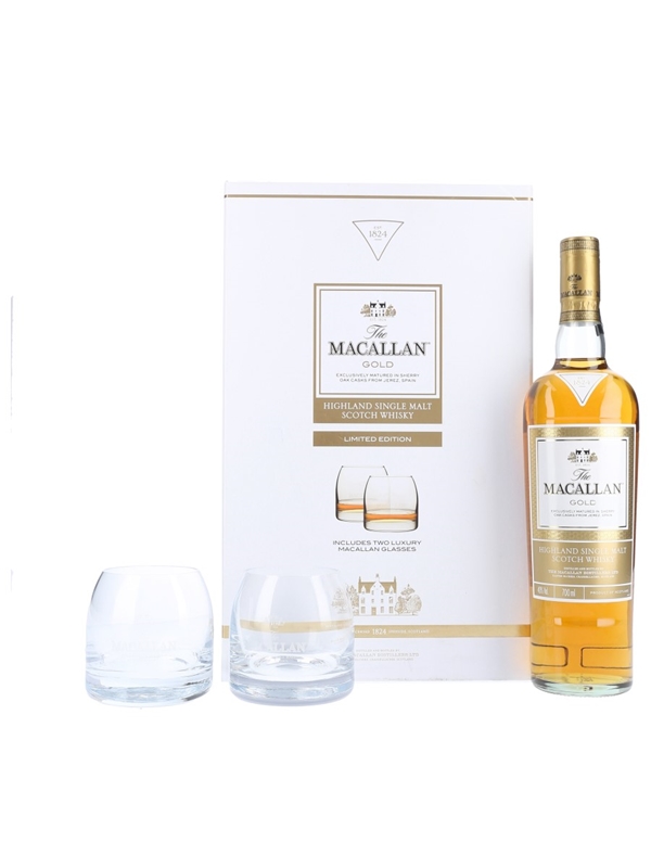 A limited edition bottle of The Macallan Gold Highland Single Malt Scotch Whisky, matured in sherry oak casks from Jerez, Spain. This was bottled as part of The 1824 Series and comes with a pair of branded tumblers in a presentation box.