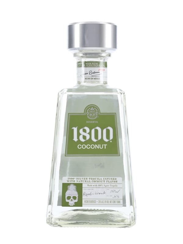 A bottle of 1800 Coconut Reserva, made with 100% Blue Agave Tequila in Jalisco, Mexico, and infused with natural coconut flavor. This was bottled for the US market.