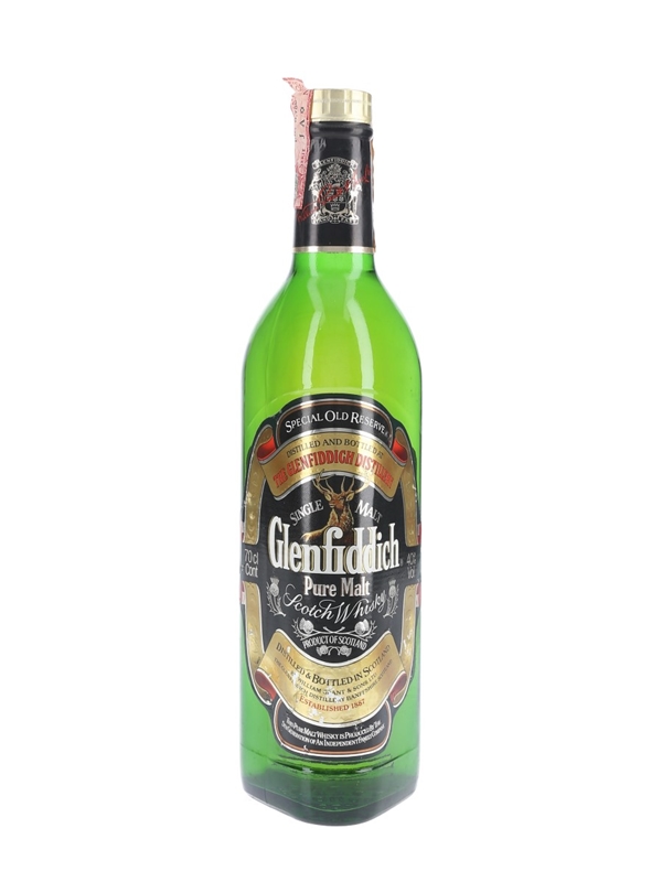 A bottle of Glenfiddich Special Old Reserve Pure Malt Scotch Whisky. This was bottled for the Italian market and imported by Campari, we estimate in the 1990s.