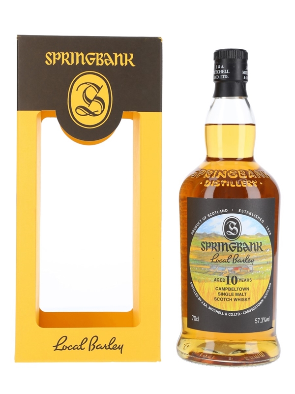 A bottle of Springbank 10 Year Old Local Barley Campbeltown Single Malt Scotch Whisky. This was distilled in June 2007 from Belgravia barley grown on West Backs Farm, matured for 10 years and bottled in November 2017.
