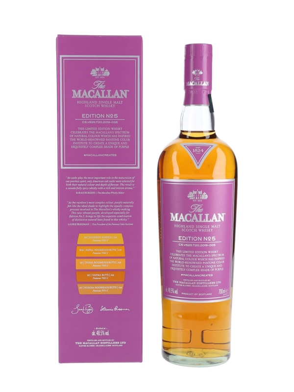 A bottle of Macallan Edition No.5, a limited edition single malt matured in five distinct cask types.