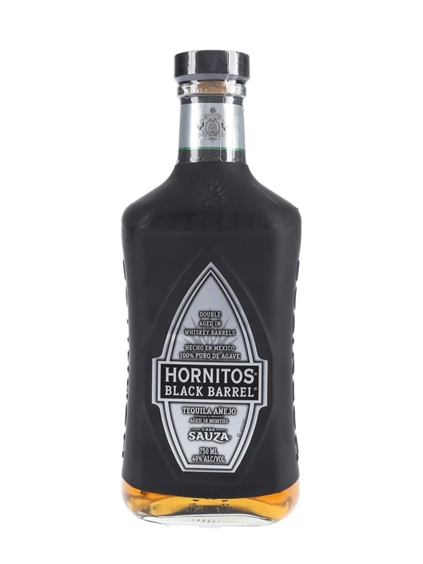 A bottle of Hornitos Black Barrel Tequila Anejo, double aged for 18 months in whiskey barrels. This was imported to the USA by Sauza Tequila Import Company.