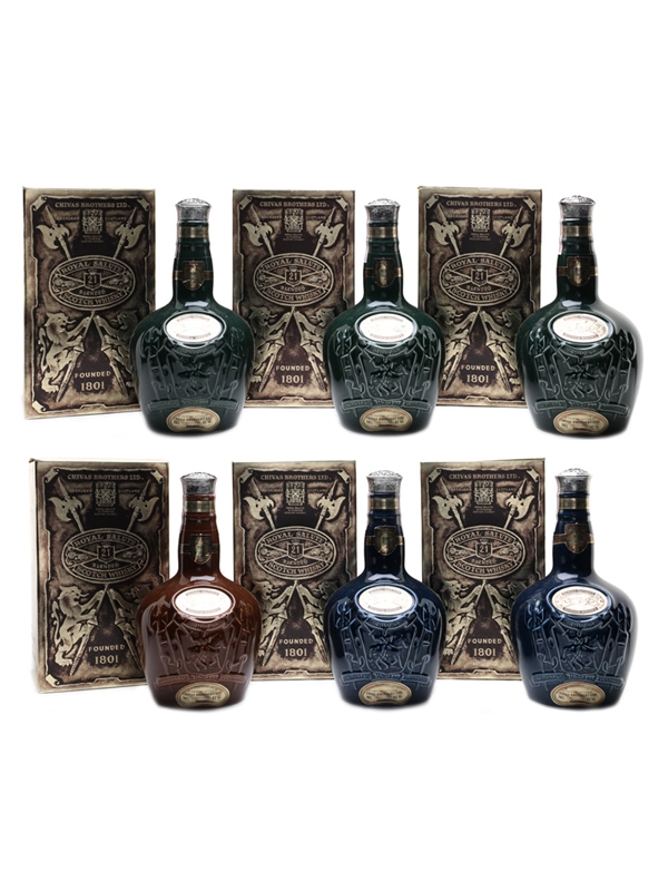 A case of six bottles of Royal Salute 21 Year Old Blended Scotch Whisky, blended and bottled by Chivas Brothers Ltd. This original cardboard box includes one brown, two blue, and three green Spode decanters. These were imported by Food & Beverage Ltd., Singapore, Malaysia, Brunei, we estimate in the 1970s to 1980s.
