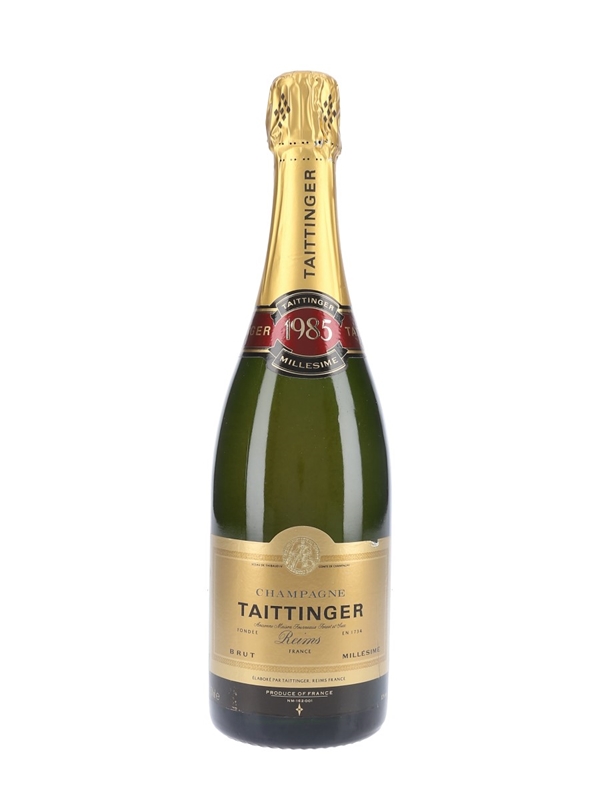 A bottle of 1985 Taittinger Brut Millésimé Champagne, a blend of 60% Pinot Noir and 40% Chardonnay.