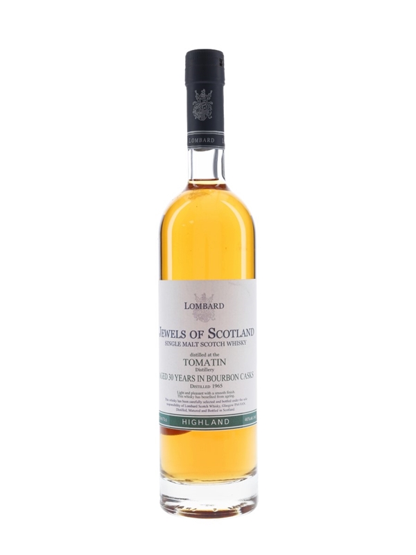 A bottle of Tomatin 30 Year Old. This was distilled in 1965, matured in bourbon casks, and bottled by Lombard Scotch Whisky for the Jewels of Scotland series.