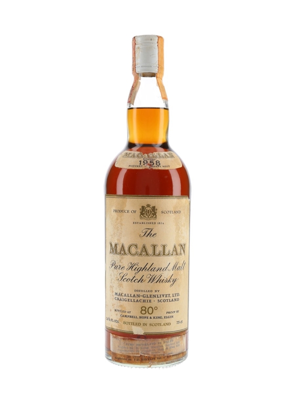 A bottle of The Macallan 1958 Single Highland Malt Scotch Whisky. This was distilled in 1958, matured in sherry wood and bottled by Campbell, Hope and King, we estimate in the 1970s. This was imported to Italy by Rinaldi.