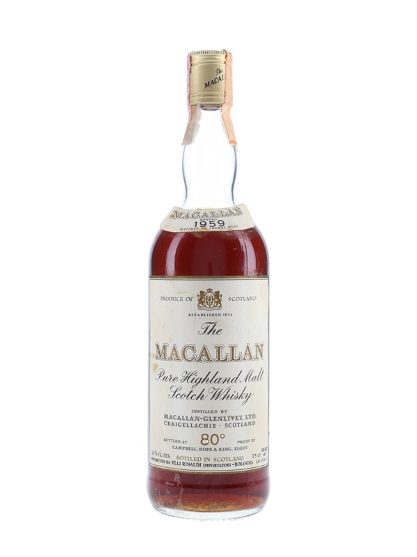 A bottle of The Macallan 1959 Pure Highland Malt Scotch Whisky. This was bottled for the Italian market and imported by Rinaldi, we estimate in the 1970s.